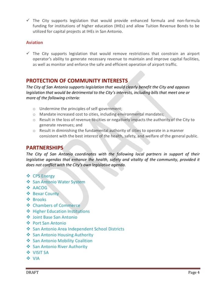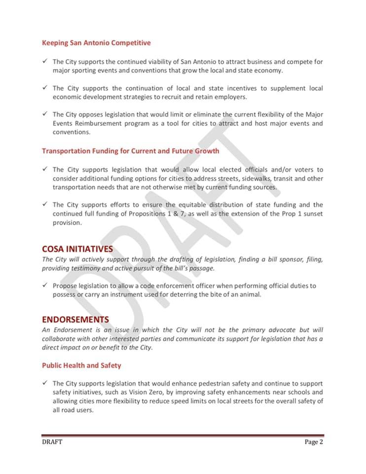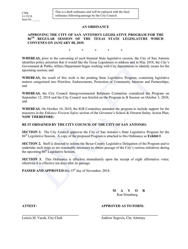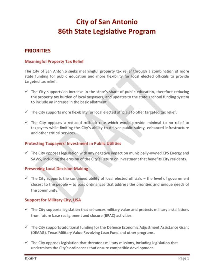 News City of San Antonio drafted 2019 Legislative Agenda November 15, 2018 SAFAFamily The San Antonio City Council considered today whether or not to approve their drafted 2019 Legislative Agenda. It opposes the reduced property tax toll back rate that taxpayers want as well as Office of the Governor Greg Abbott and the Texas Senate.