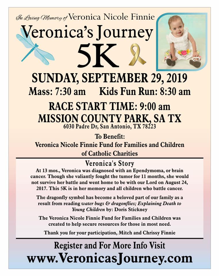 We are happy to announce the 1st Annual Veronica’s Journey 5K to take place on Sunday, September 29, 2019 at Mission County Park, San Antonio, Texas.