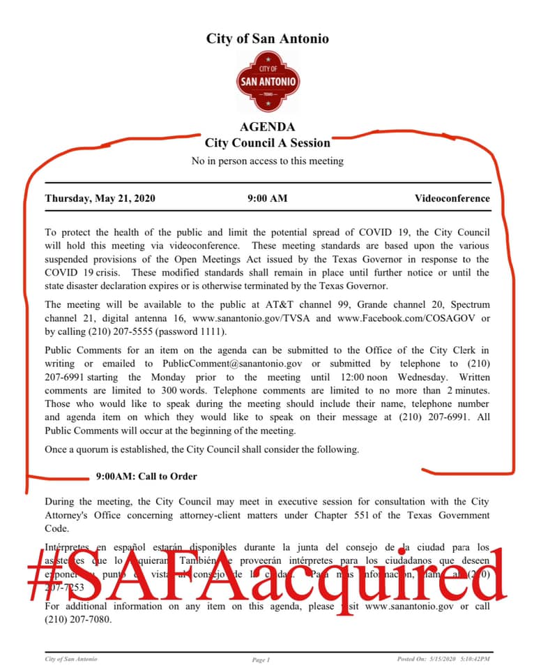 Not mad enough yet to act? Well City of San Antonio – Municipal Government posted this Thursday’s A Session Agenda on Friday, May 14th staying NO Citizens To Be Heard in person. One wishing to be heard will have to record a phone message or send in an email as you can read from the posted Agenda. Then it was changed 3 times on Saturday evening!